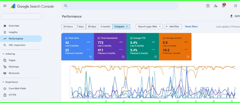 This image represents the Performance section of Google Search Console displaying a comparison between the last three months and the previous three months of web search data. The dashboard highlights a noticeable improvement in overall SEO performance, with total clicks increasing from 22 to 42 and total impressions rising from 411 to 772, indicating enhanced search visibility.